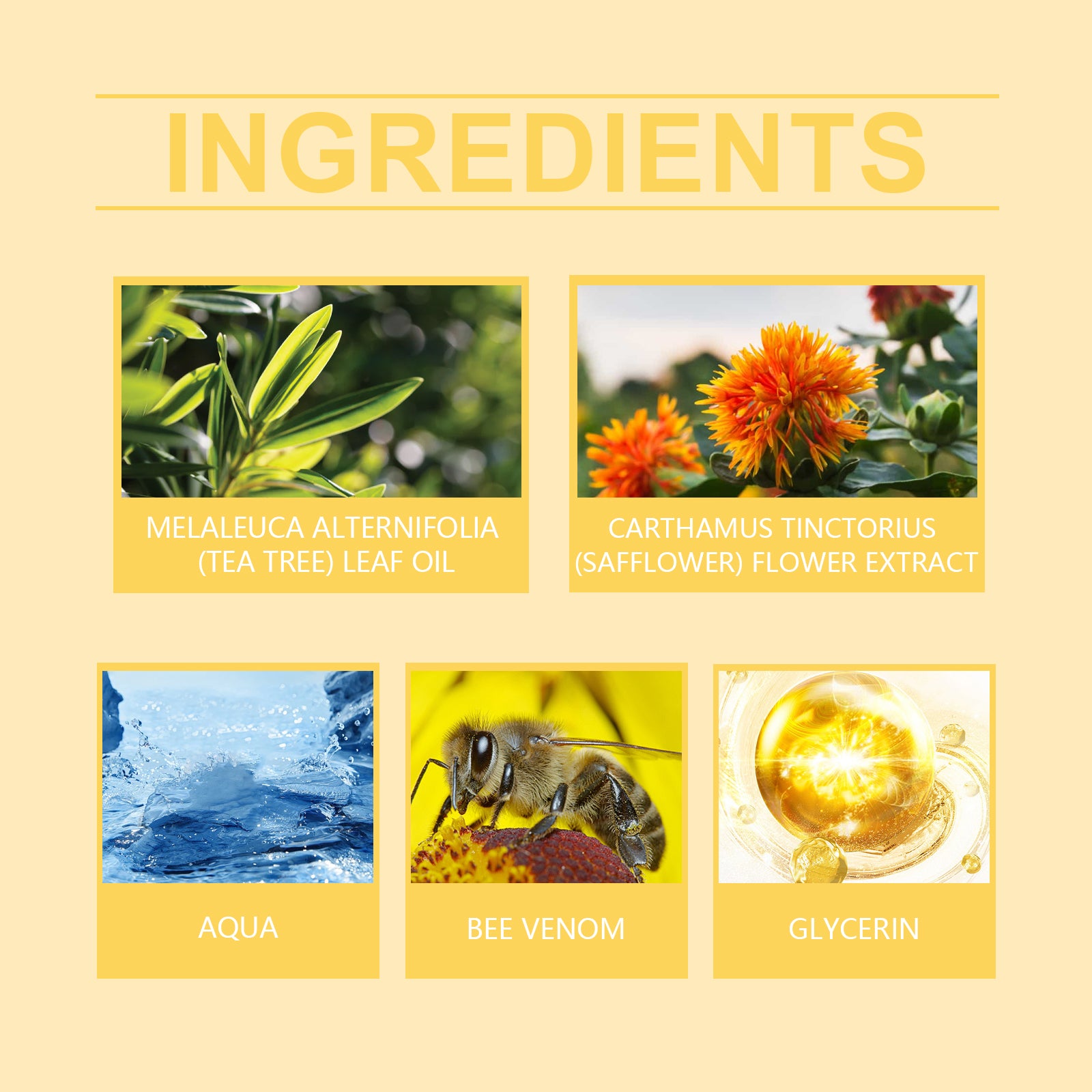 Our bee Venom foot care spray contains safflower extract, glycerin. It can provide a sustained soothing effect to reduce foot pain and stress and improve comfort. Its application is simple: first thoroughly clean the skin of the foot and dry it. Take appropriate amount of this product and spray it on foot skin. And spray design, easy to use anytime, anywhere, easy to carry. Suitable for all skin types, whether dry or sensitive.